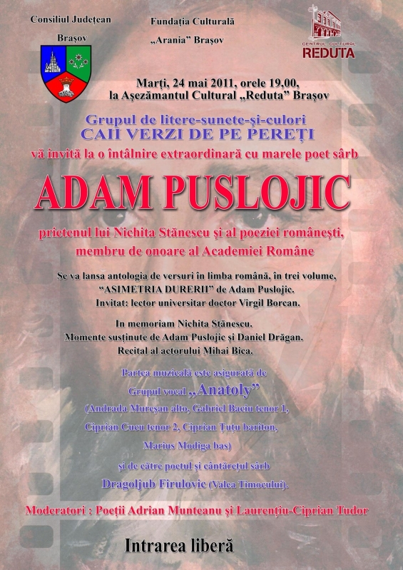 Adam Puslojic, cunoscut publicului larg ca prieten bun al poetului Nichita Stanescu si continuator al operei acestuia prin lecturile sale vii si traduceri, vine pentru prima data la Brasov cu ocazia lansarii antologiei sale de versuri in trei volume Asimetria durerii.