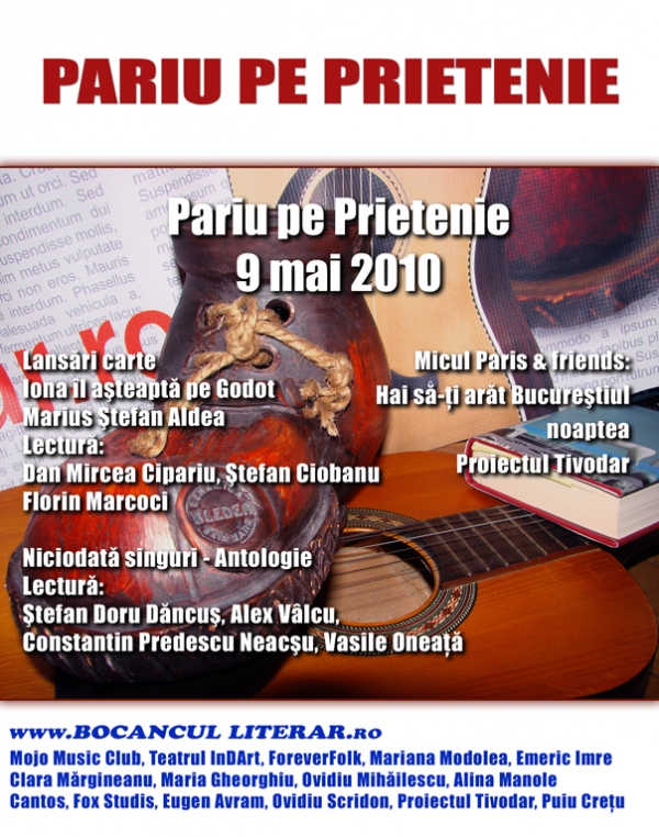 Bocancul literar si partenerii sai va invita duminica, pe 9 mai, la o noua editie a Pariului de Prietenie. Pe muzica asigurata de Micul Paris se vor lansa doua carti: „Iona il astepta pe Godot” a poetului Marius Stefan Aldea si antologia „Niciodata singuri”.
