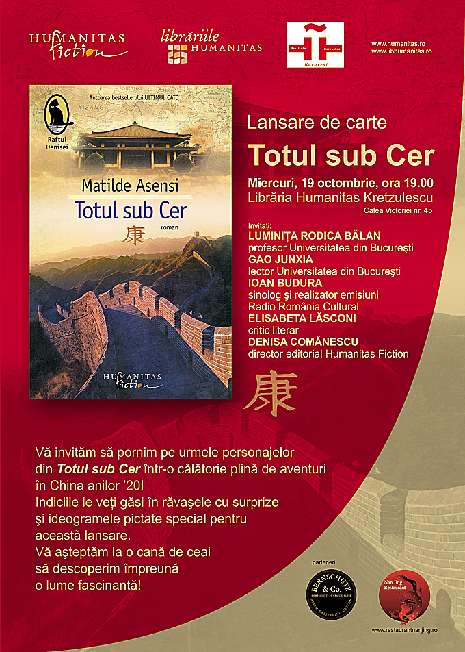 Editura Humanitas Fiction si Institutul Cervantes din Bucuresti lanseaza romanul “Totul sub cer” de Matilde Asensi. Lansarea de carte va avea loc la Libraria Humanitas Kretzulescu (Calea Victoriei, nr. 45), miercuri, 19 octombrie, de la ora 19:00.