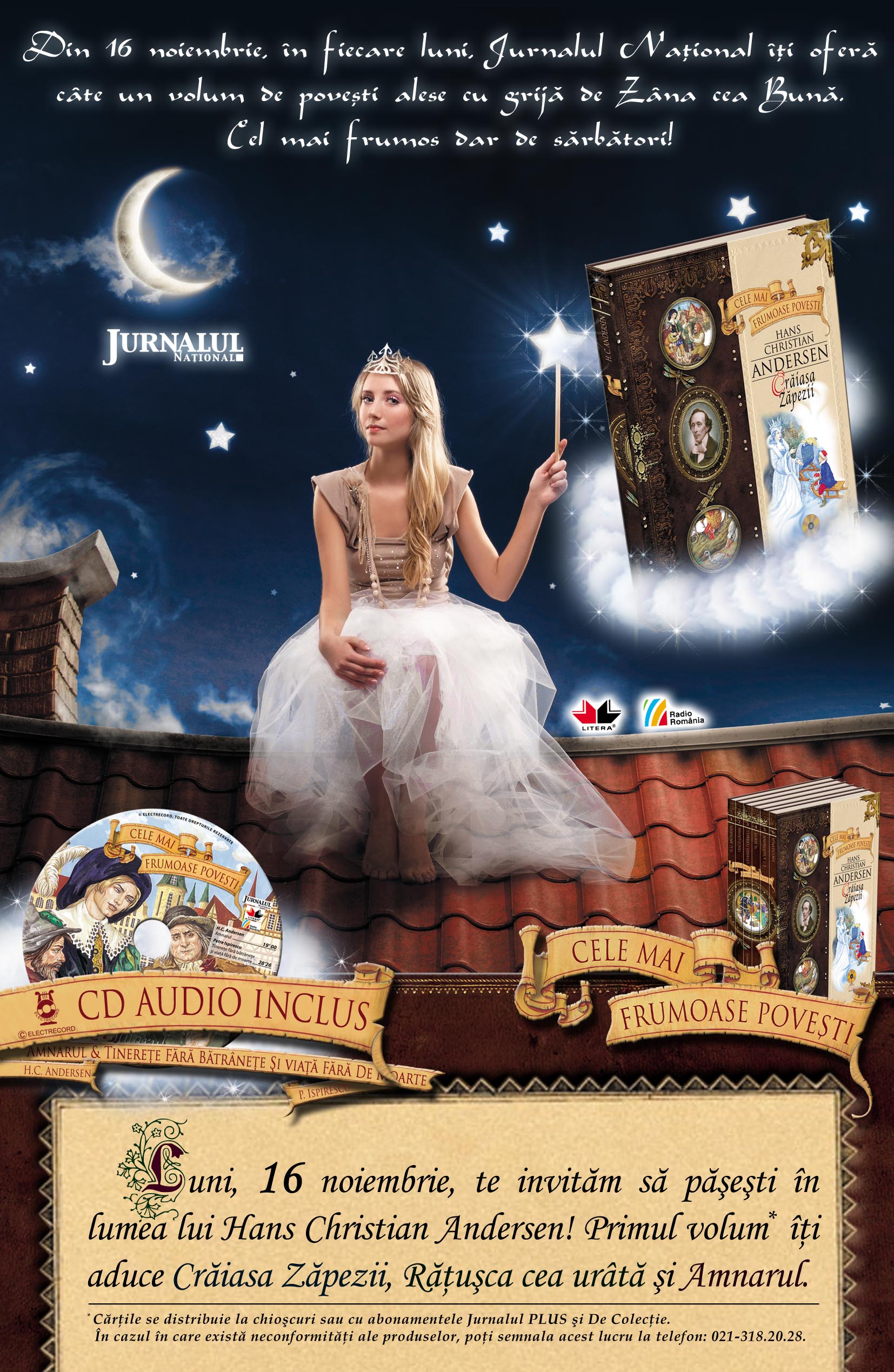 Jurnalul National ofera carti si CD-uri cu povesti, incepand din 16 noiembrie. Timp de 6 saptamani, in fiecare luni, oamenii sunt imbiati cu cele mai frumoase povesti scrise vreodata. Nume precum Hans Christian Andersen, Fratii Grimm, Charles Perrault, W. Hauff, E.T.A. Hoffmann, Ion Creanga se vor regasi in aceasta colectie de poveste.