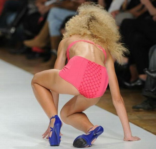 Frumoasa din imagine nu a vazut la intrarea pe catwalk avertismentul pus de femeia de serviciu: ATENTIE, PODEA UMEDA!