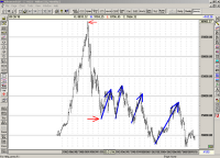 In ’89 asa numitul miracol japonez s-a spart. Keynesianismul debil, folosit pana atunci si dupa, a avut efectele pe care le vezi. O cadere in picaj cu durata de circa 3 ani (intre cele doua sageti rosii), urmata de reveniri substantiale (sageti albastre), corectate mai apoi tot in directia de miscare a picajului. Rezultat? O economie care si-a mancat circa 75% din valoarea si potentialul avut in ’89. De remarcat este faptul ca aceasta distrugere s-a produs in pofida faptului ca Japonia a mai avut pana in 2007 – 2008 piete de export.