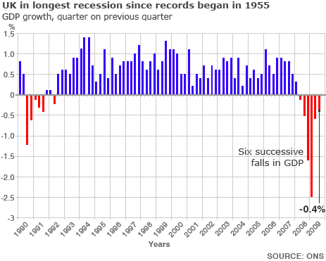 Economia Marii Britanii s-a contractat cu 0.4% in ultimul trimestru (iulie-septembrie). Aceasta inseamna ca Marea Britanie se afla in cea mai lunga recesiune din istorie (de cand a inceput monitorizarea economiei). Este pentru prima data cand economia insulei se contracta al saselea trimestru la rand. Reprezentantii Institutului National de Statistica din Londra se asteptau la o crestere de cel putin 0.2%. Aceste date sunt inca provizorii insa se asteapta ca ele sa aiba o influenta negativa asupra mediului de afaceri.