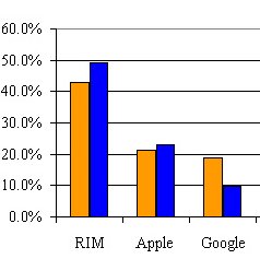 Research in Motion (RIM) isi va mentine in continuare prima pozitie cu BlackBerry, dar cota sa de piata va scadea de la 49% la 43%. Apple isi va mentine pozitia secunda cu 21,3%, fata de 23,1% anul trecut. Per total insa, cele doua companii isi vor creste vanzarile datorita cresterii pietei, cu 21% BlackBerry si cu 27% iPhone.