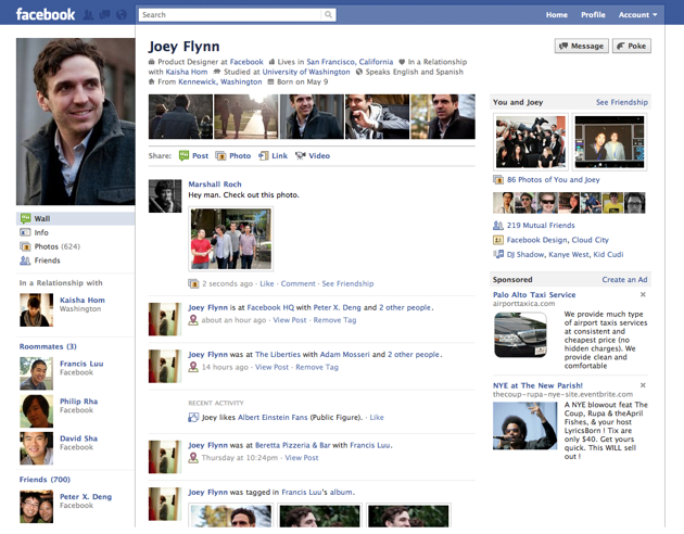 Va prezentam mai jos o captura de ecran, cam neclara, cu noua forma a unei pagini de profil. Butonul “Message” va fi mai usor vizibil iar pozele vor putea fi accesate de sub sectiunea “basic info”. Taburile “Wall” si “Info” vor aparea in stanga, sub poza de profil.