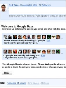 Serviciul Buzz, lansat pe 9 februarie, este integrat Gmail si permite clientilor sa isi posteze statusuri, sa impartaseasca continut, sa citeasca si sa comenteze posturile prietenilor lor. Ceea ce a creat imediat ingrijorare a fost decizia Google de a face automat o lista cu un grup de prieteni bazata pe frecventa cu care ei au corespondat pe Gmail. Daca utilizatorii nu fac schimbari in profilul lor, lista devine in mod automat publica, permitand tuturor sa vada cu cine a corespondat mai mult un utilizator.