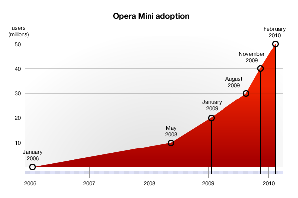 Opera Mini, browserul de internet destinat telefoanelor mobile, a ajuns la 50 de milioane de utilizatori activi. Aplicatia a fost lansata in 2006 si a avut nevoie de doi ani si jumatate pentru a ajunge la 10 milioane de utilizatori. In ultima vreme avansul a fost mult mai rapid. In perioada ianuarie 2009 – ianuarie 2010 Opera Mini a crescut cu 150% (vezi in tabelul de mai jos).