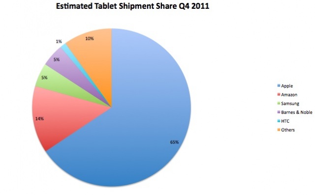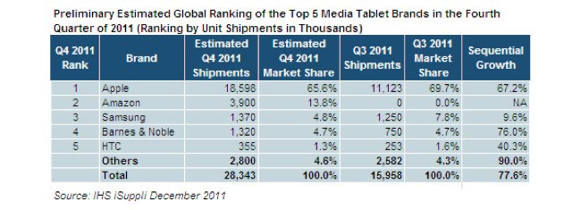 Totusi, la momentul actual pe primul loc se afla iPad 2, asteptata sa ajunga 18,6 milioane de utilizatori in acest trimestru, in vreme ce podiumul este completat Samsung Galaxy Tab, cu livrari de 1,9 milioane de unitati.