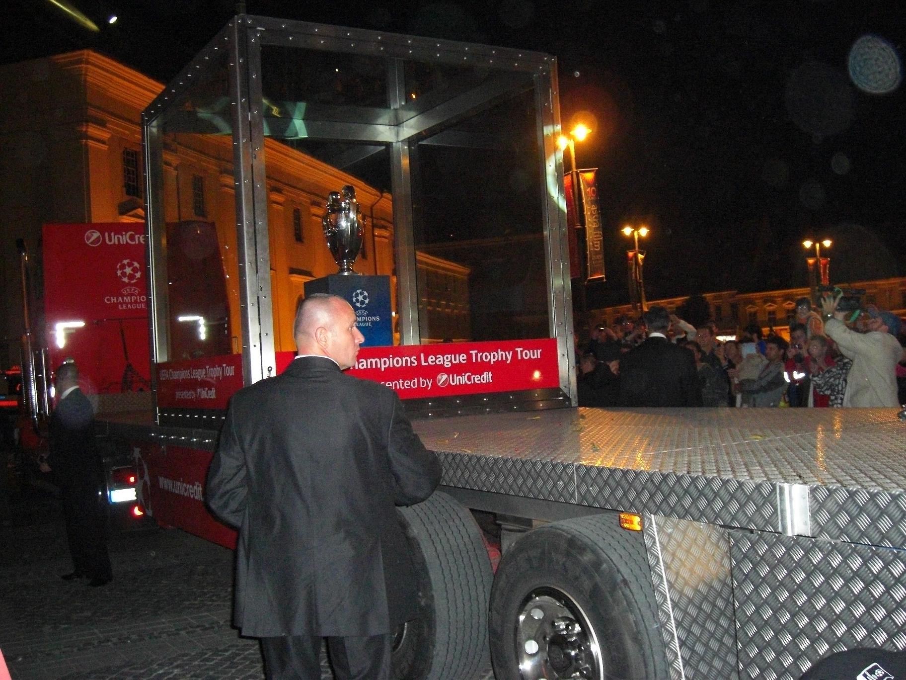 Mult ravnita cupa din UEFA Champions League a fost prezenta aseara in Piata Mare din Sibiu. Trofeul de argint se afla pe teritoriul Romaniei, intr-un circuit ce va cuprinde 6 orase: Arad, Timisoara, Sibiu, Brasov, Pitesti si Bucuresti.