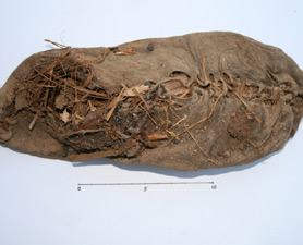 Incaltarea, confectionata din piele de vaca, este posibil sa fi fost ingropata intentionat in balega in timpul unui ritual, potrivit cercetatorilor. Asta deoarece alaturi de mocasin au fost gasite ingropate si alte obiecte: un craniu de copil, trei oale, precum si containere continand orez, caise si alte plante.